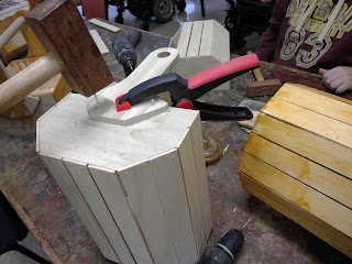 In this case there were aspects of the construction process that were so difficult that I needed to invent some extra help. Here is little bench clamp that holds up the basket end. At the beginning stage the unsupported end won’t stay still while we bang at it with our hammer.