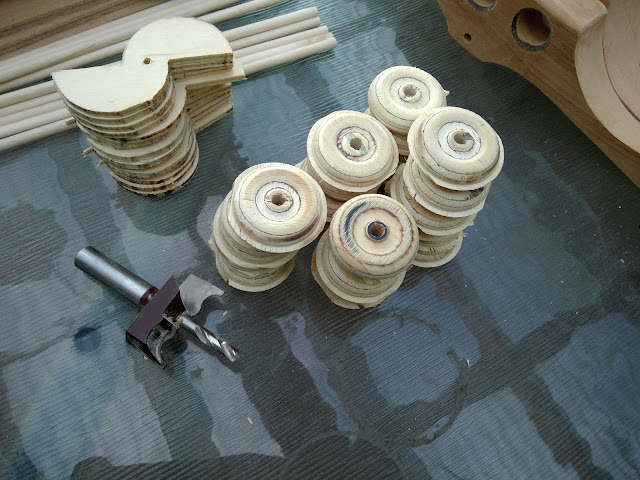 Here is my little cutter beside the wheels. There is no rule for drill speed here, it needs vary with timber species as with gentleness from the user. Finding the sweet spot is a rewarding moment. |